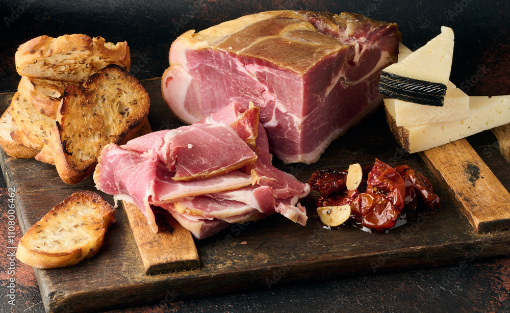 A piece of prosciutto, slices of ciabatta and cheese on a wooden board