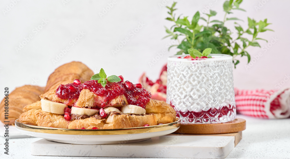 Croissant with chocolate, banana pieces and raspberry jam on a plate