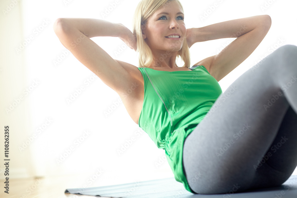 Woman, fitness and sit ups at home for workout, thinking and abdominal core exercise for six pack training. Health, strength and wellness with athlete, living room floor and stomach toning challenge