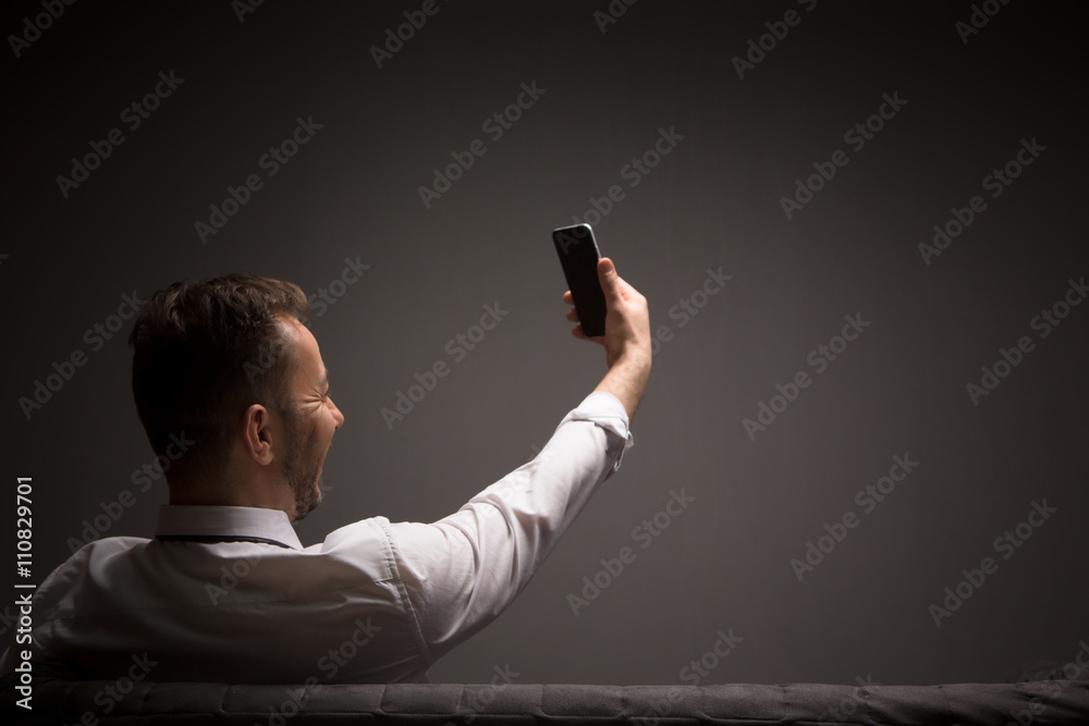 Happy businessman making selfies on his mobile phone while sitting on comfortable sofa in studio.