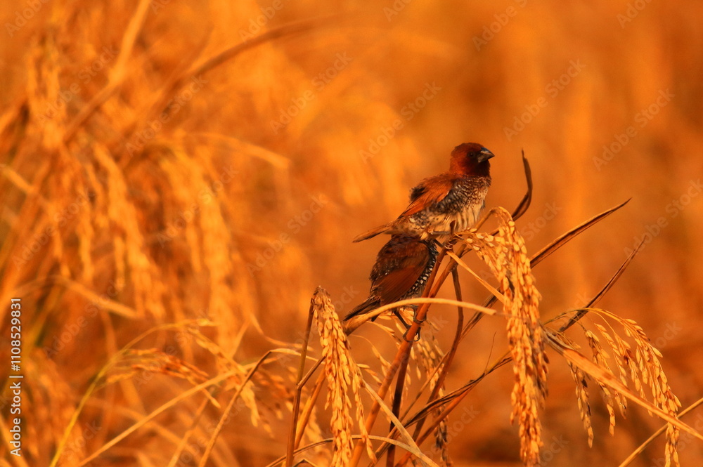 beautiful scaly breasted munia or spice finch or nutmeg mannikin (lonchura punctulata) in paddy field, countryside of west bengal in india