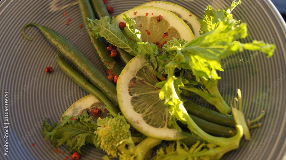 Detox lunch green beans with lemon, pink pepper, turnip flowers, green vegetables, healthy food, low calorie food, salad, Italy