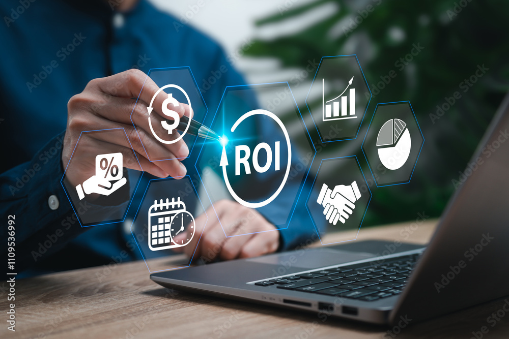 ROI Return On Investment concept, Business Women analyse financial growth, invest money, calculate profit, Banking, Retirement Money, resources yielding a benefit, Digital marketing financial growth