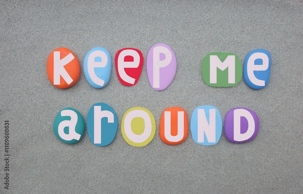 Keep me around, creative text composed with multi colored stone letters over green sand