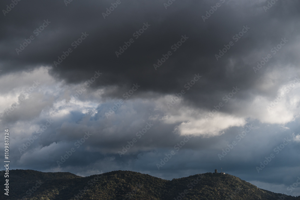 View of hills under rainy clouds