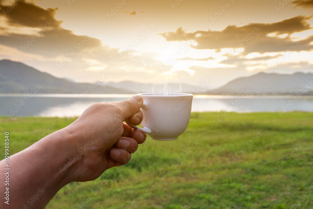Hand holding a white cup of hot espresso coffee mugs and nature view background in the morning with sunlight