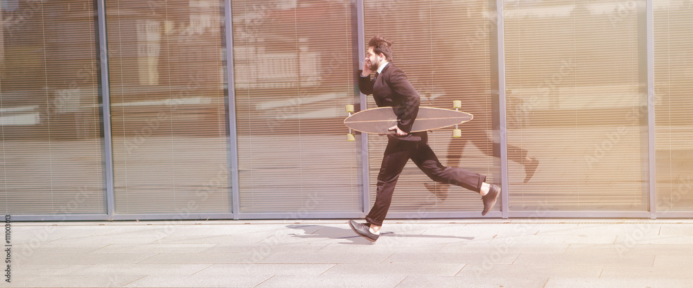 Toned picture of businessman running with skateboard or longboard. Handsome man looking forward and speaking over mobile phone.