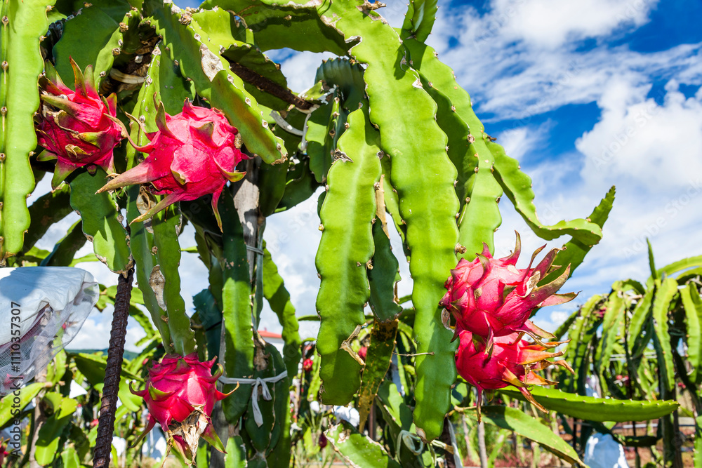 Close-up of ripe pitaya growing on the pitahaya tree in Taiwan.