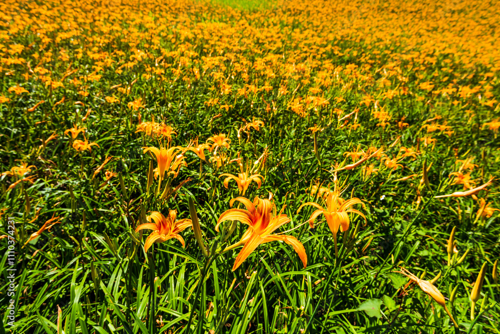 Close-up of the long yellow lilies (daylilies) in the garden, Chike Mountain (Jinzhen Mountain) of Hualien, Taiwan.
