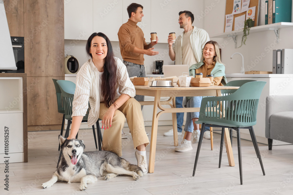 Young woman with Husky dog and her colleagues during lunch in office kitchen