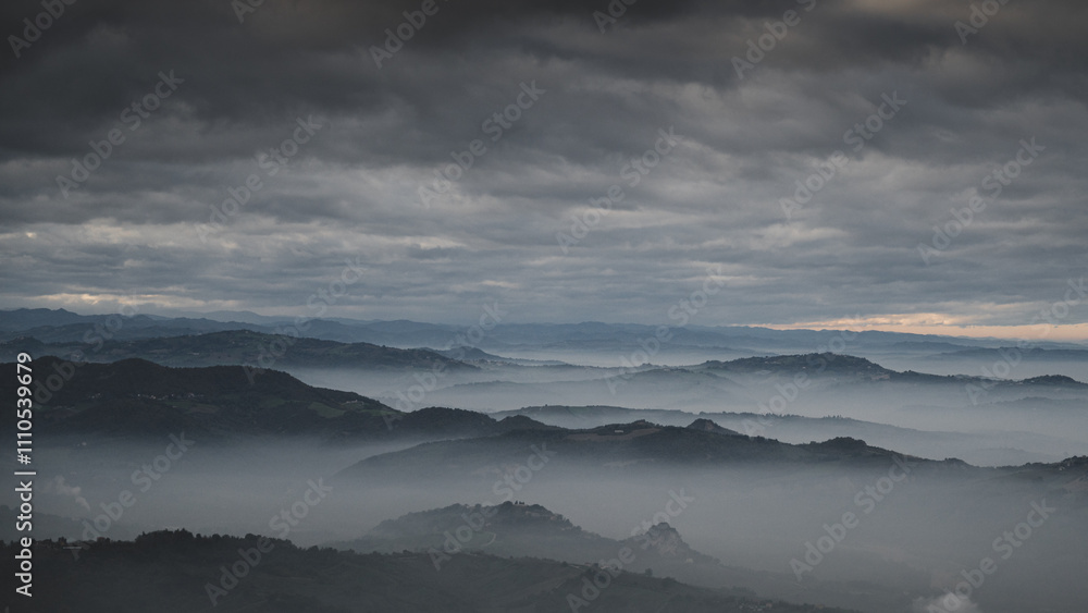 Vista mozzafiato delle montagne marchigiane di fronte a San Marino. C'è anche un pò di nebbia che da poesia e leggerezza all'ambiente