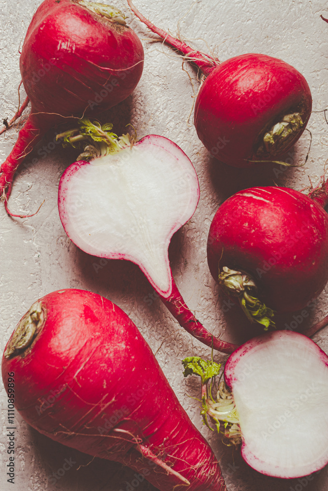 Freshly harvested red radishes displayed on a neutral surface highlighting their vibrant color and crisp texture