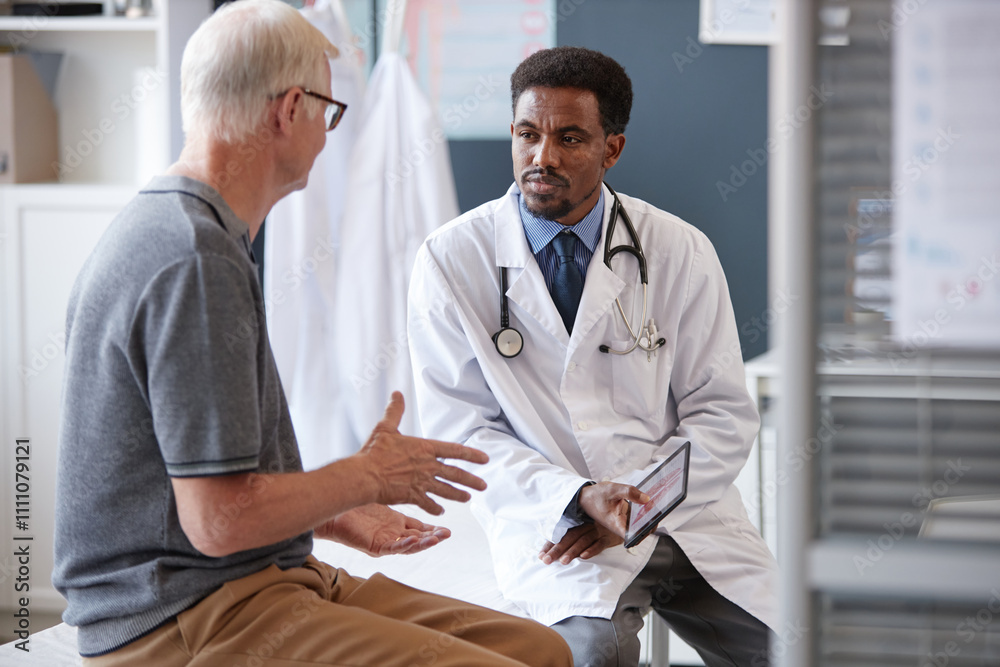 Waist up portrait of serious African American doctor wearing lab coat and holding tablet while listening to senior patient during discussion in clinic, copy space