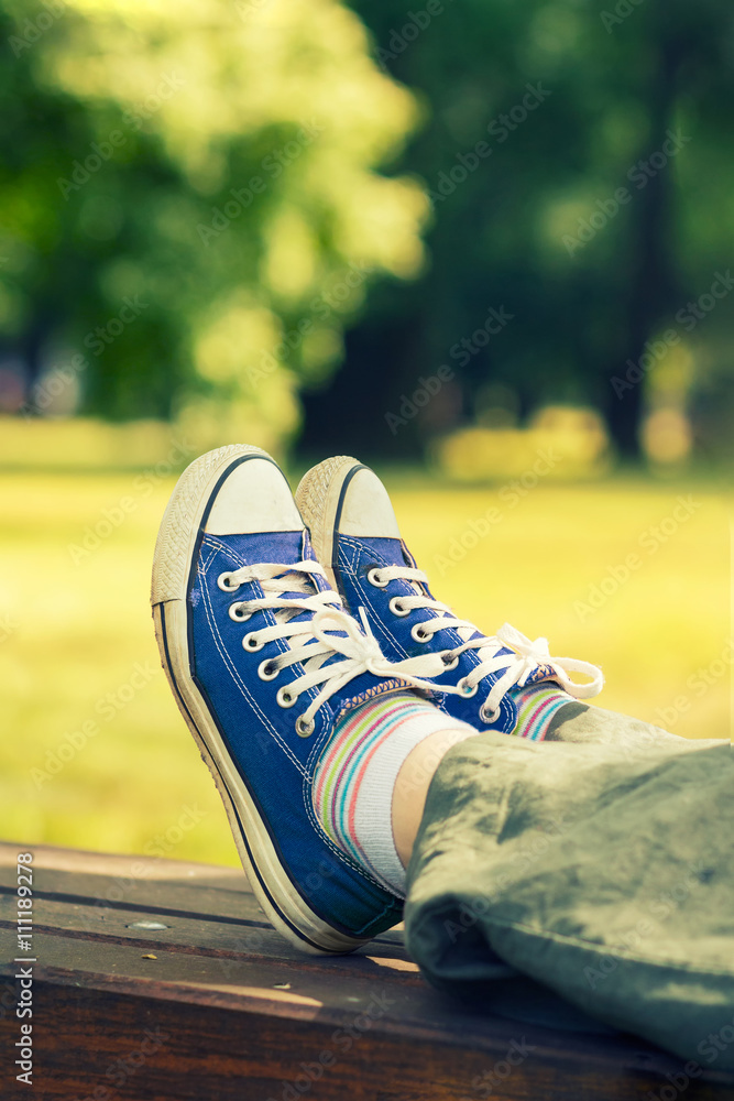 Woman's feet in a dark blue canvas sneakers sitting on a bench.