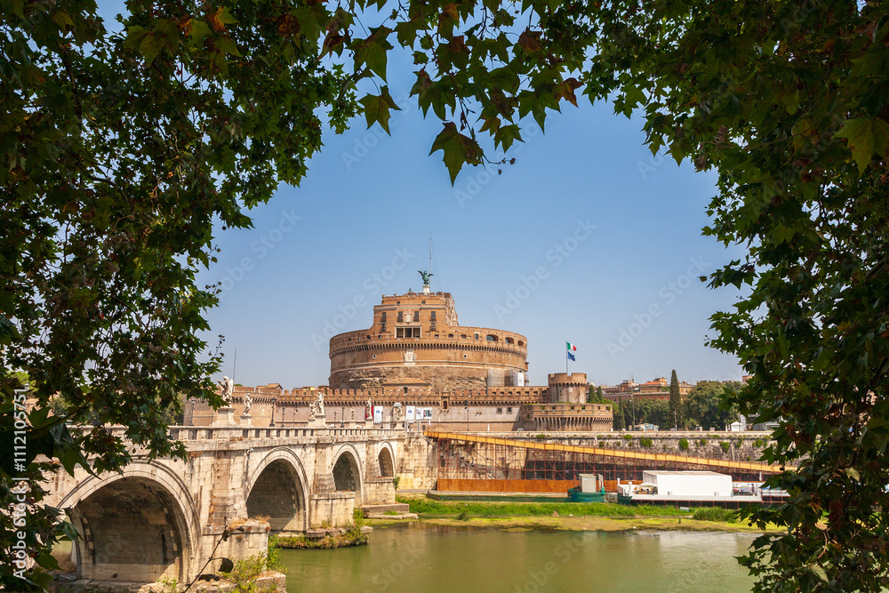 Castel Sant'Angelo Framed by Lush Trees Along the Tiber River in Rome