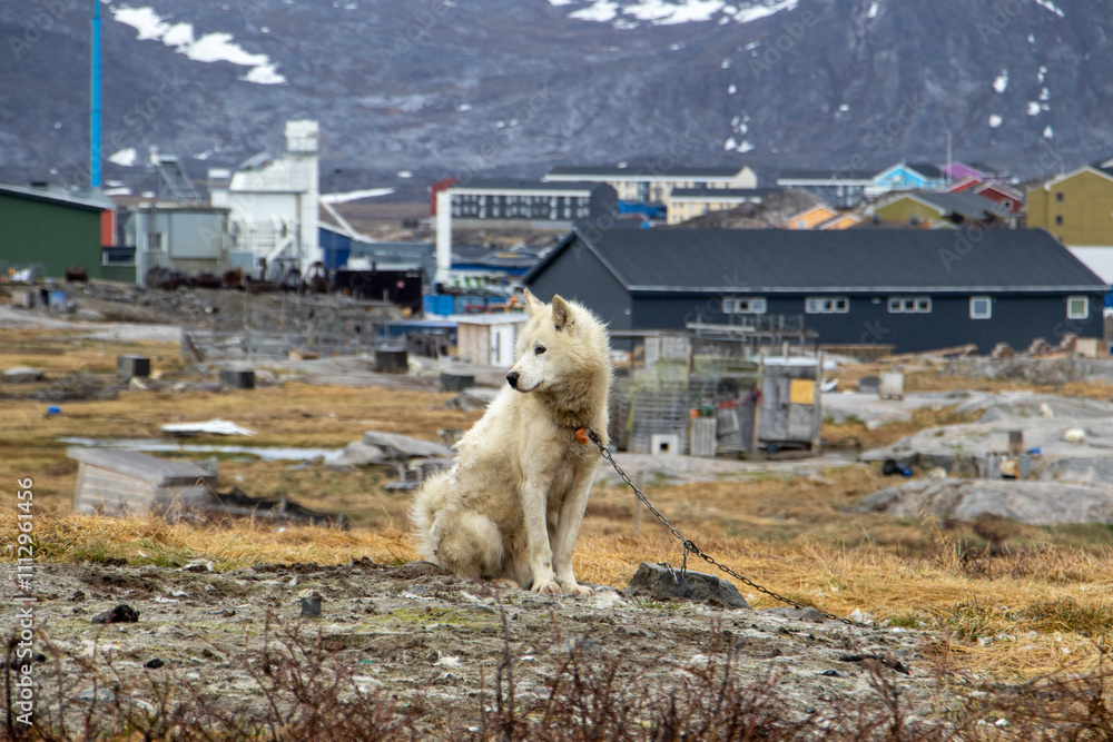 Sled dog chained in a Greenland settlement with colorful houses and rugged terrain