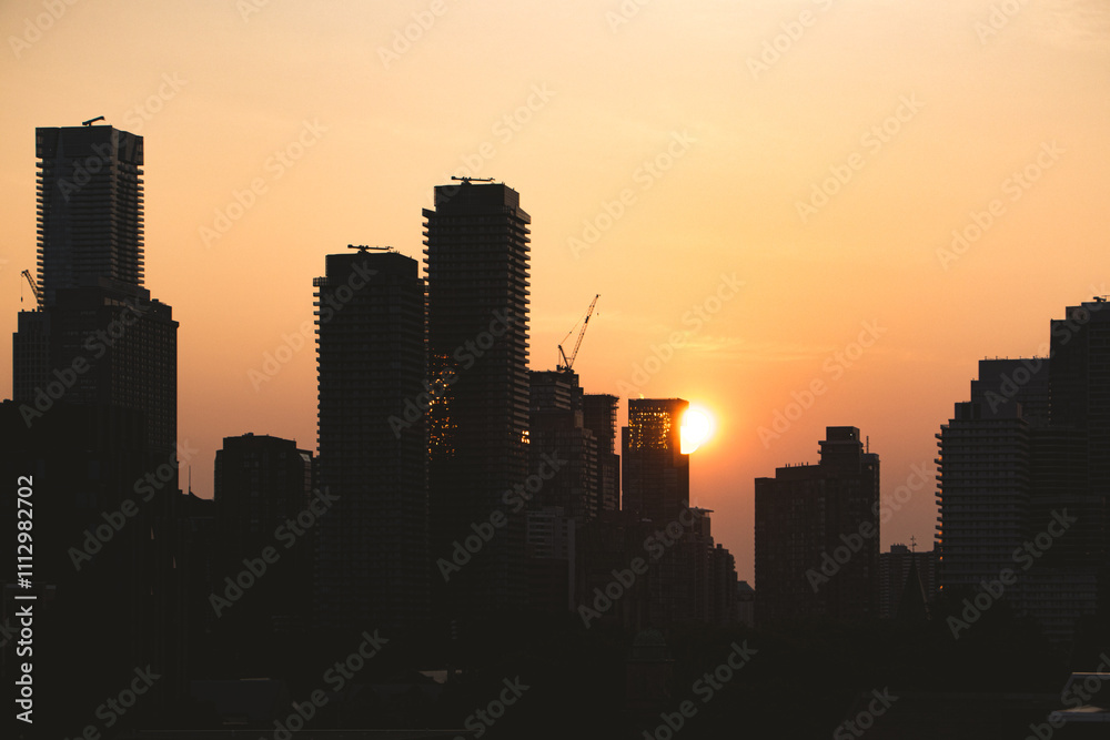 Silhouette of Toronto skyscrapers at sunset with golden sunlight reflecting off the buildings