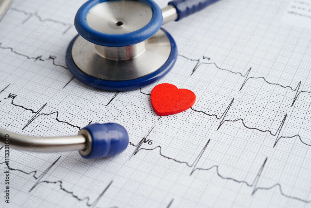 Stethoscope on electrocardiogram (ECG), heart wave, heart attack, cardiogram report.