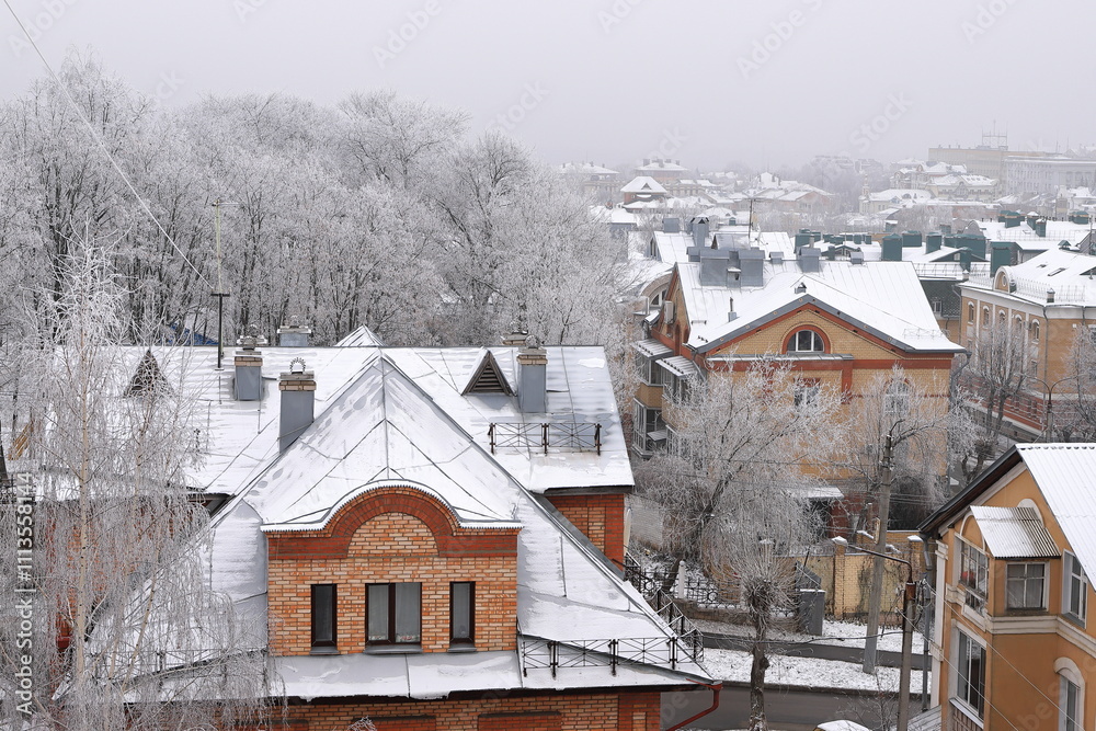 Cityscape of a small town on a winter day with snow-covered roofs of houses, streets and trees.