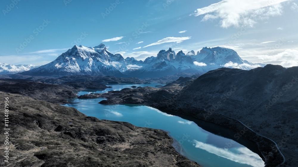 National Park Of Torres Del Paine In Puerto Natales Chile. Snowy Mountains. Glacier Landscape. Puerto Natales Chile. Winter Background. National Park At Torres Del Paine In Puerto Natales Chile.