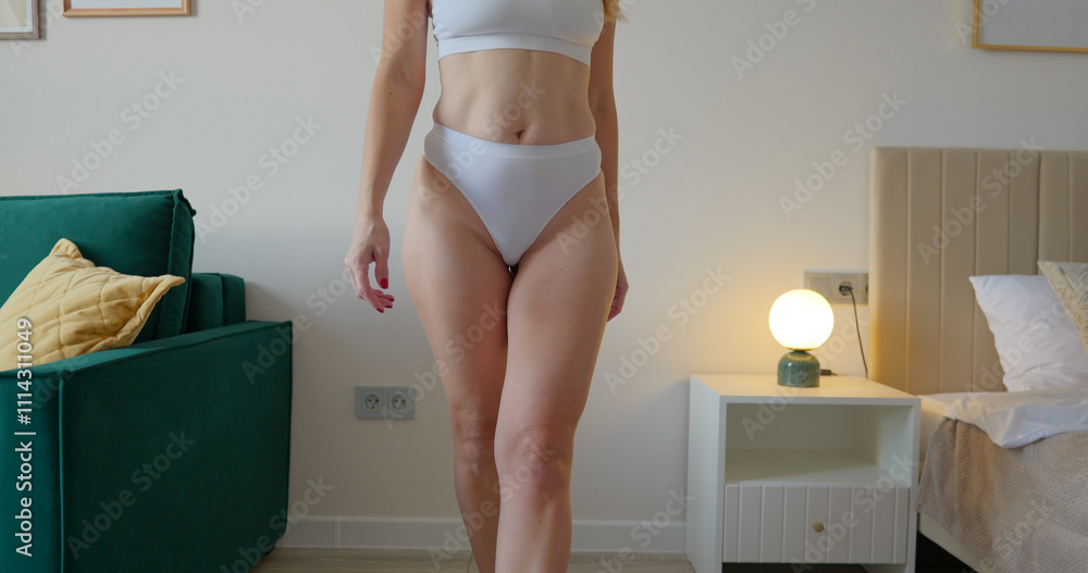 Fit Woman in White Lingerie Weighing Herself in the Morning