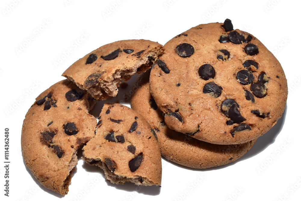 Oatmeal cookies made from shortcrust pastry with chocolate chips lie on a white background.