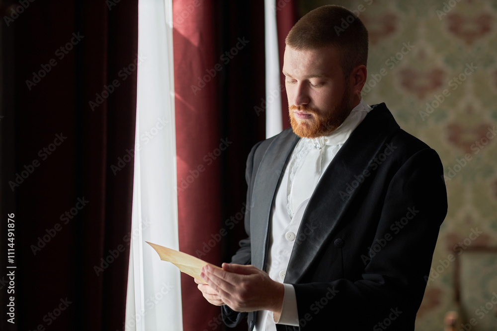 Waist up portrait of red haired gentleman in tailored suit reading letter while standing by window in softly lit vintage interior, copy space