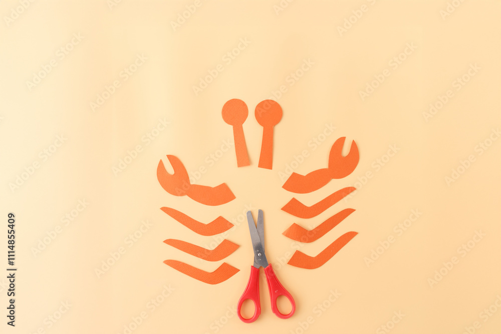 a pair of red-handled scissors and several pieces of orange paper cut into various shapes. what appear to be crab claws, legs, materials for a craft project, DIY project,
