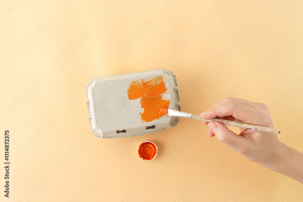 Painting an egg carton orange with a brush for a DIY craft project on a peach background. Hands crafting in progress. Creative recycling and kids activity concept,