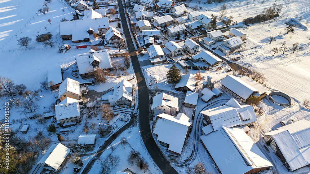 Roofs of houses in the snow from a bird's eye view in Germany