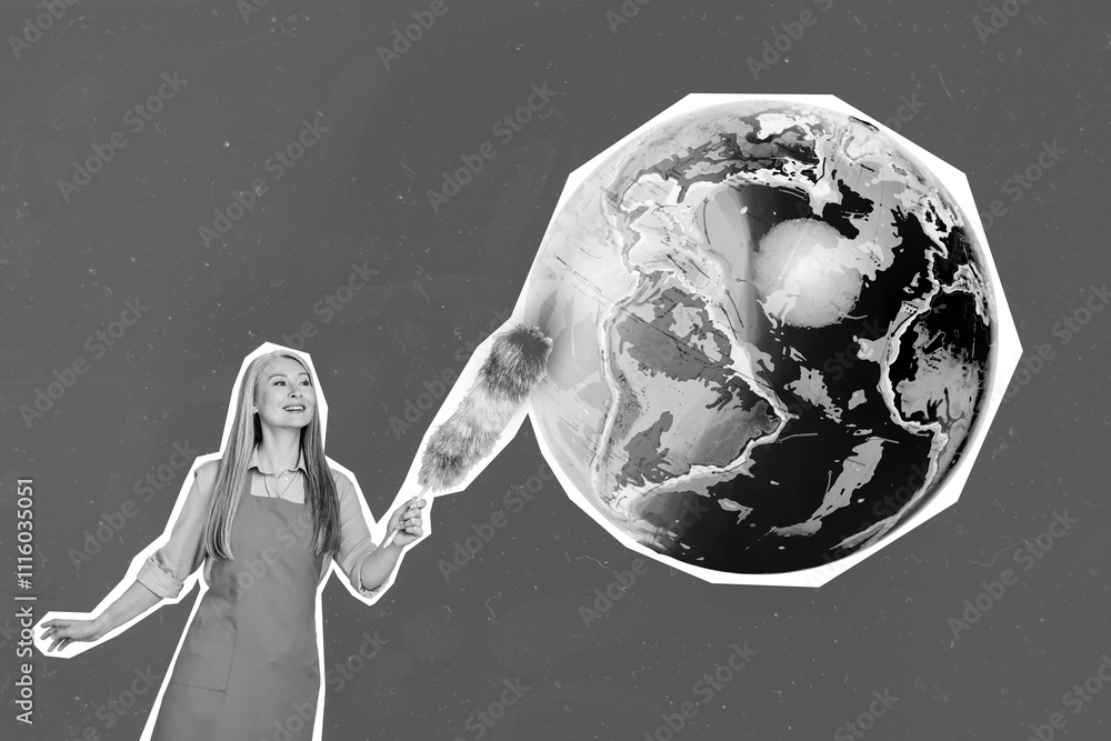 Collage photo of mature age woman housekeeper washing tidy dust from earth sphere planet pollution isolated on bright blue color background