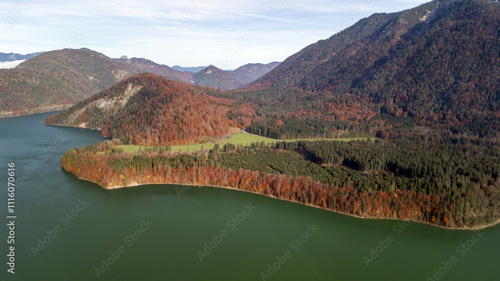 Isar River Sylvensteinsee Alpine foothills mountains in autumn Aerial View