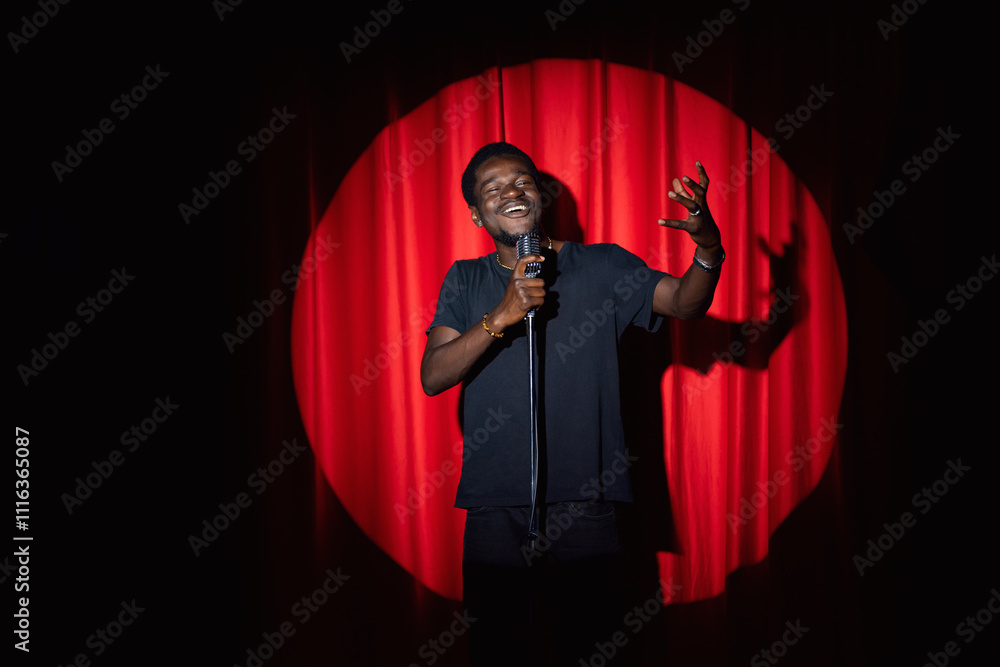 Smiling African American man speaking to microphone performing in comedy show open mike stand up on stage with red curtains.