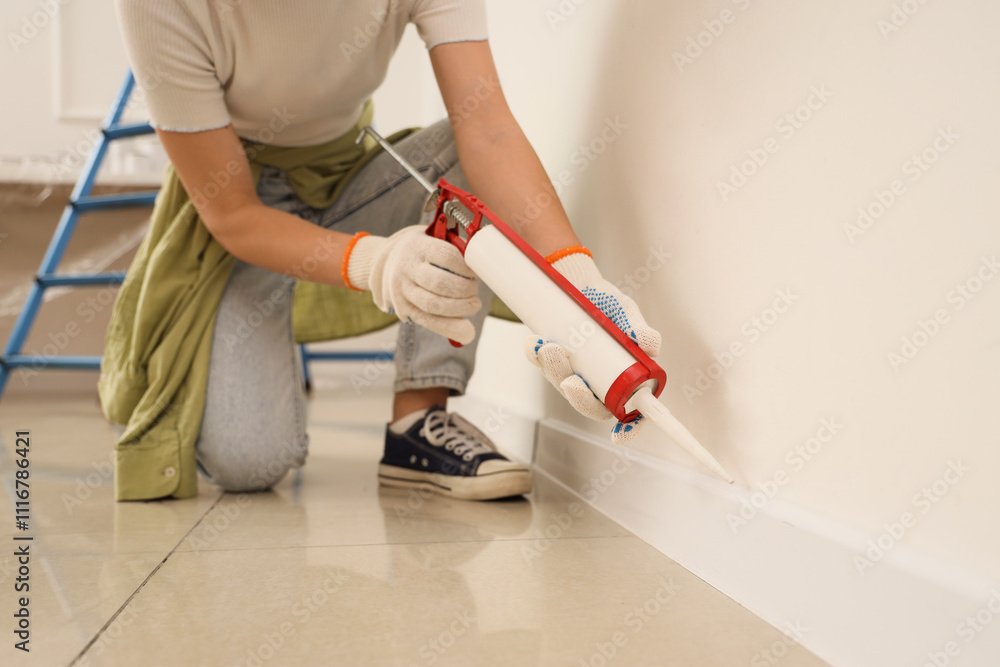 Young woman applying sealant to baseboard in room