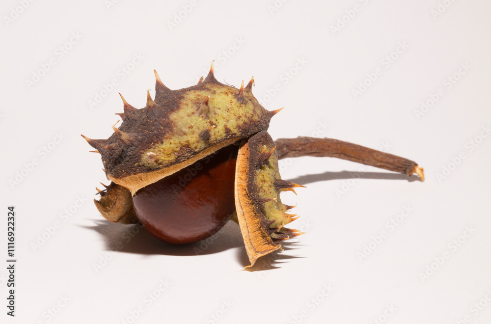 Mature horse chestnut fruits with a peel on a white background. Aesculus, buckeye.