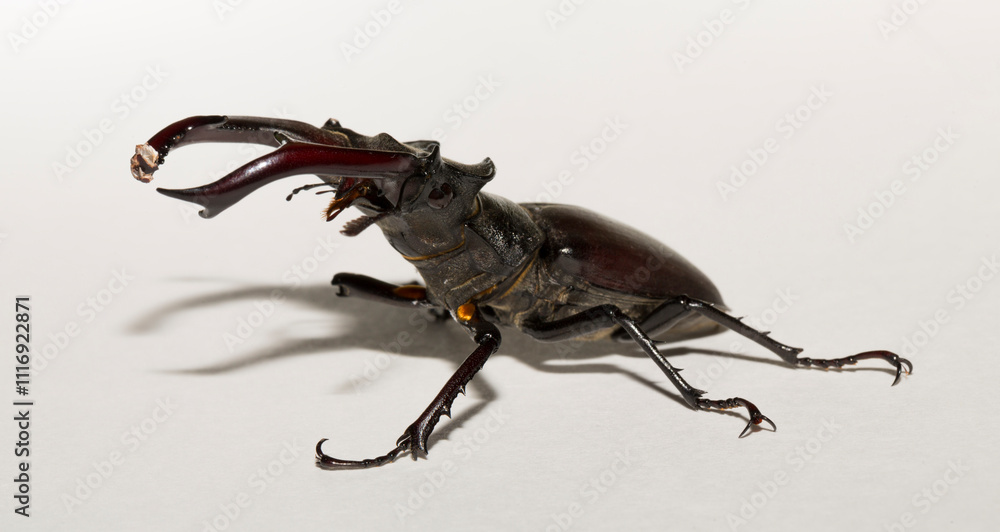 Lucanus cervus is the best-known species of stag beetle (family Lucanidae) in Western Europe. Imago, a male insect on, a white background.