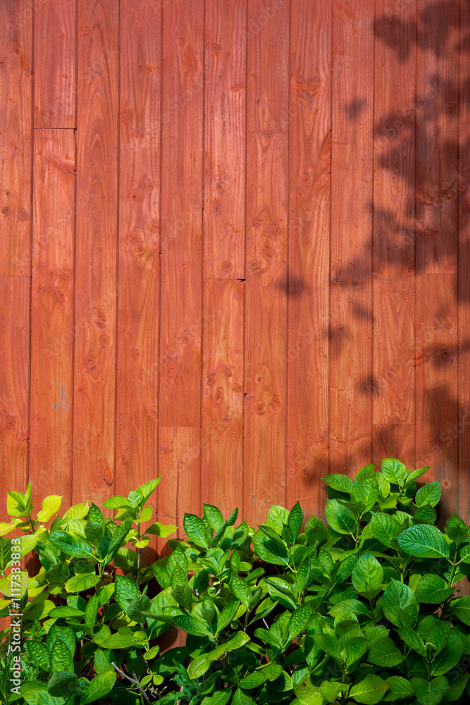 Palissade de bois peint dans un jardin au soleil.