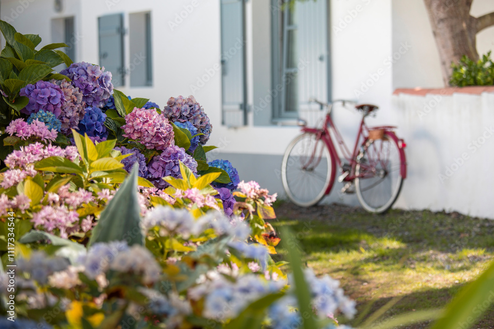 Vieux vélo rouge au pied d'une maison et son jardin fleuri.