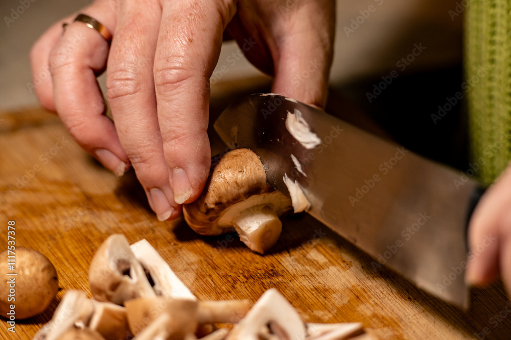 action de découpe d'un champignon de Paris avec un couteau de chef, en gros plan