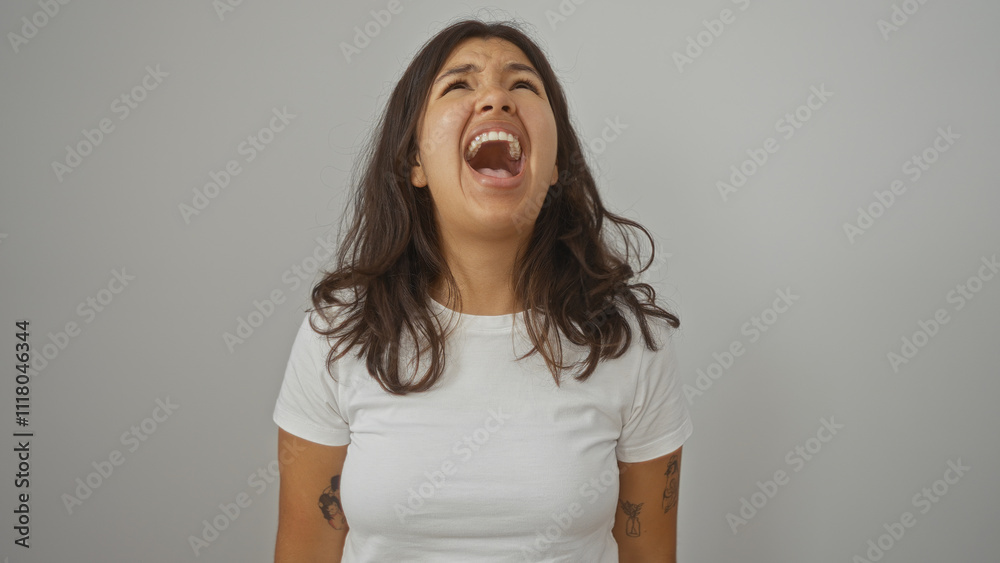 Young woman screaming looking upwards with a frustrated expression in an isolated white background