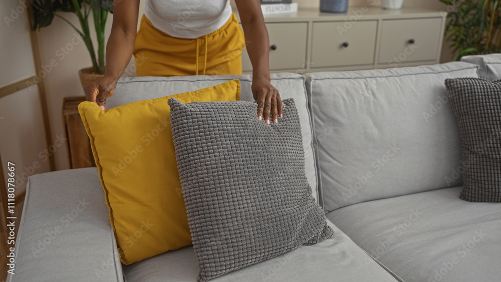Woman arranging yellow and gray pillows on a modern gray sofa in a cozy, home interior