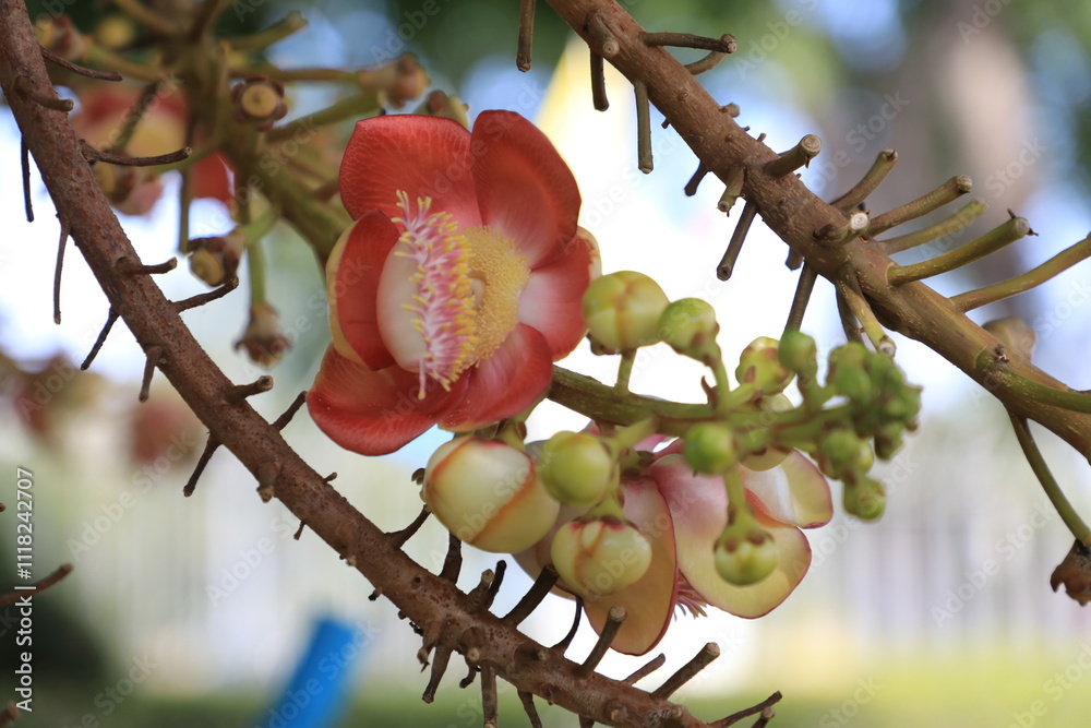 Close-up of a beautiful Shorea Robusta Roxb., commonly known as the Sal flower, blooming on a tree. The image captures the rich colors and texture of the bloom,