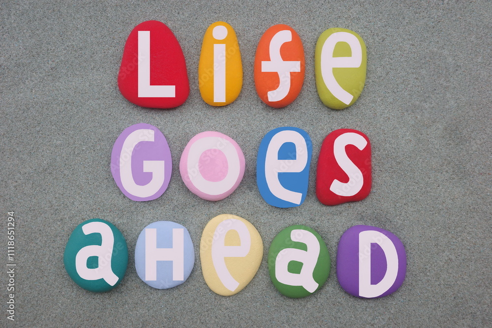 Life goes ahead, social slogan composed with multi colored hand painted stone letters over green sand