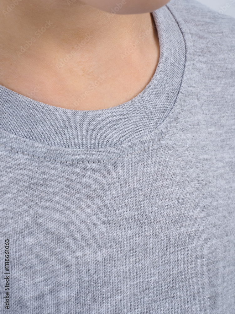 Gray t-shirt on a person. Simple gray t-shirt design. Close-up of gray t-shirt fabric. Minimalist gray t-shirt style.