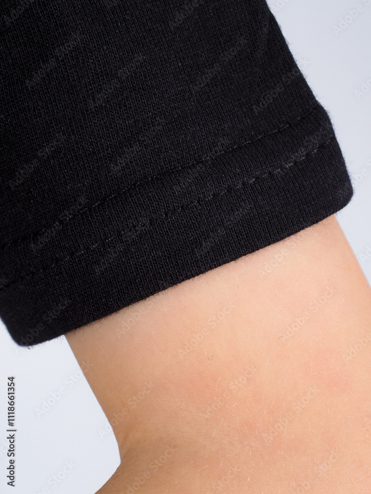 Black t-shirt on a person. Simple black t-shirt design. Close-up of black t-shirt fabric. Minimalist black t-shirt style.
