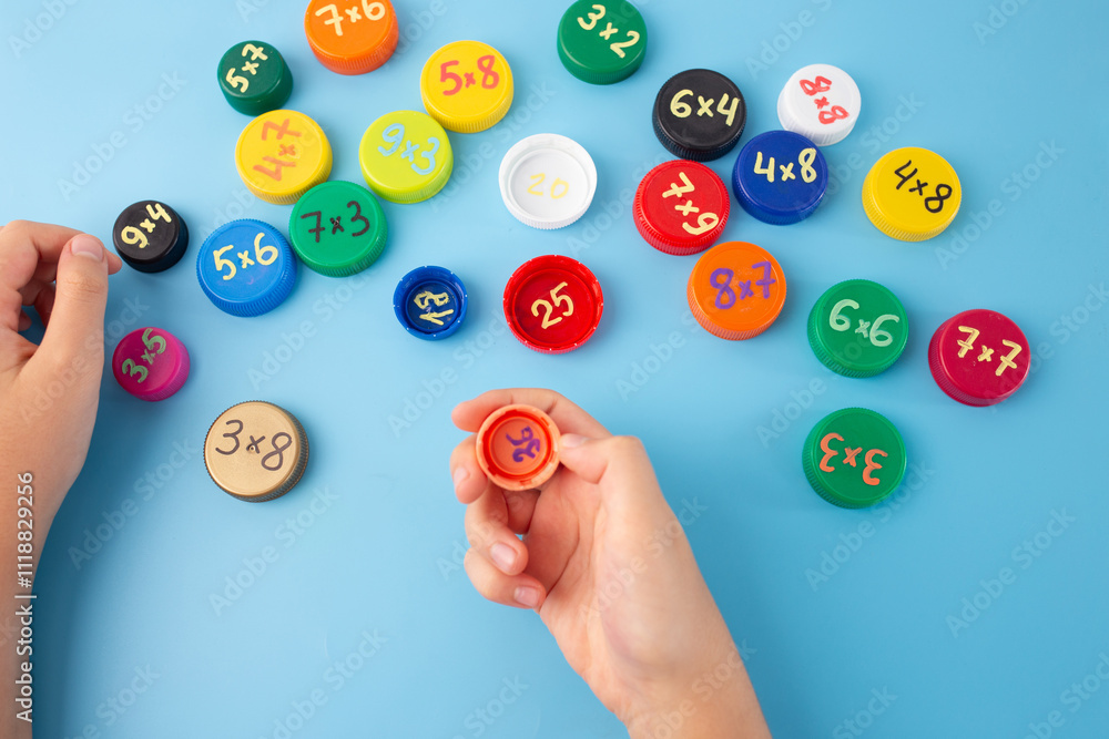 Childs hands arranging colorful bottle caps with multiplication problems on a blue background. Flat lay educational concept for learning and math games,