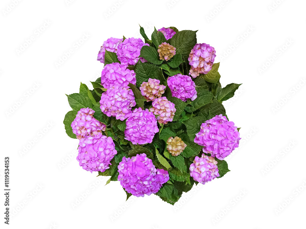 Close-up photo of many beautiful purple hydrangea flowers isolated on transparent background png file.