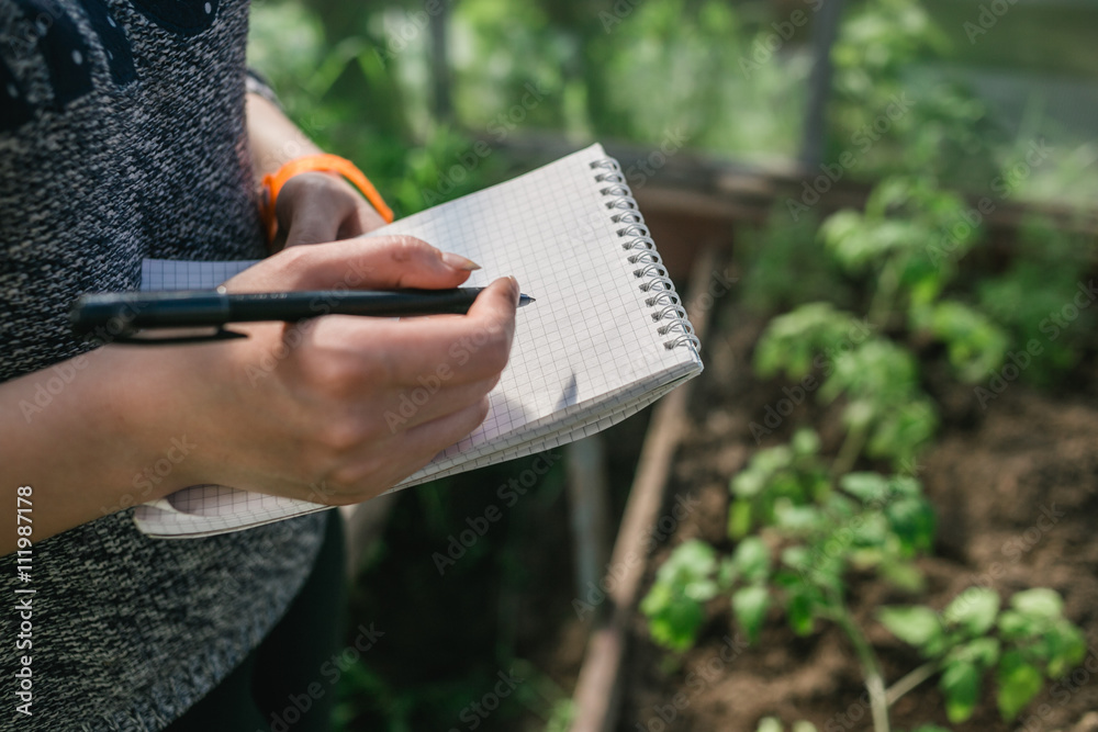 Closeup hands of greenhouse worker taking notes in seedlings in nursery