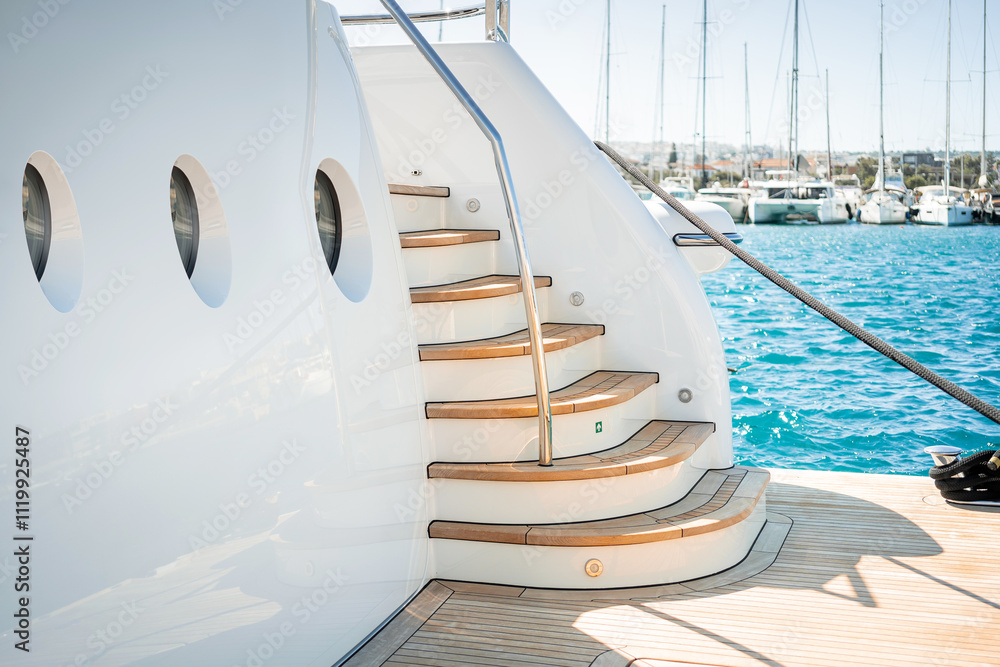 Stern and swim platform of a modern superyacht at dock with beautiful golden teak deck staircase while in a marina with blue sky, and blue sea in the background