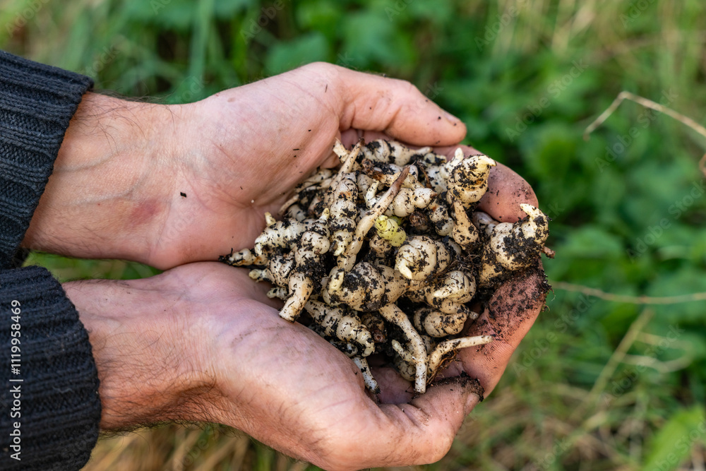 crosnes du Japon fraichement récoltés, photo en extérieur avec dans les mains de la personne une belle poignée de crosnes du Japon fraichement récoltés